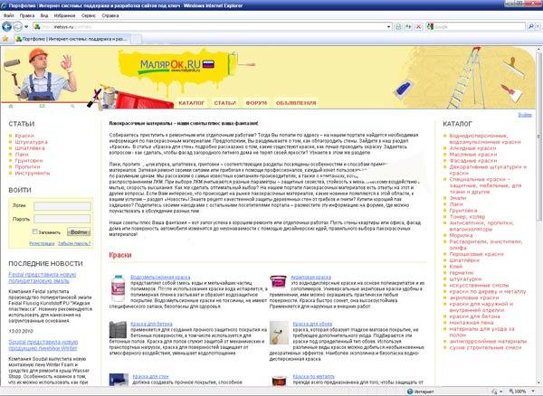 Портал «Малярок.RU» создан для тех, кто занимается ремонтом своей квартиры или дома, работает в сфере строительства. Здесь посетитель найдет всю информацию о лакокрасочных материалах, инструментах. Портал разработан таким образом, чтобы поиск занял как можно меньше времени. Созданы специальные разделы – «краски», «штукатурка», «грунтовка» и др. Регулярно обновляется новостная лента, из которой можно узнать обо всех новинках, выпускаемых такими компаниями, как Feidal, Soudal и др. Подробнее о компаниях производителях лакокрасочных материалов можно узнать из раздела «Каталог брендов». На портале работает форум, раздел бесплатных объявлений.