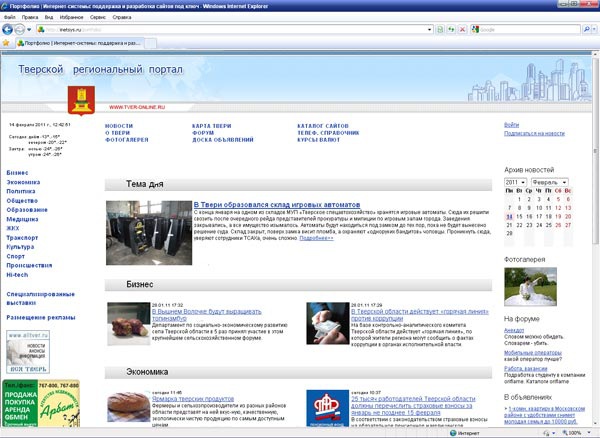 Тверской региональный портал «Тверь-онлайн» - это актуальные новости, касающиеся Твери и области, информация по истории Твери, полезные телефоны и адреса учреждений и предприятий. Новостная лента обновляется ежедневно и является основной составляющей портала. Каждую новость можно прокомментировать. Навигация продуманна и удобна: названия разделов говорят сами за себя - «Карта Твери», «Фотогалерея», «Телефонный справочник»,. Активно работает форум, где обсуждаются самые интересные события города и региона в целом из области спорта, культуры, политики. Постоянно пополняется доска бесплатных объявлений.